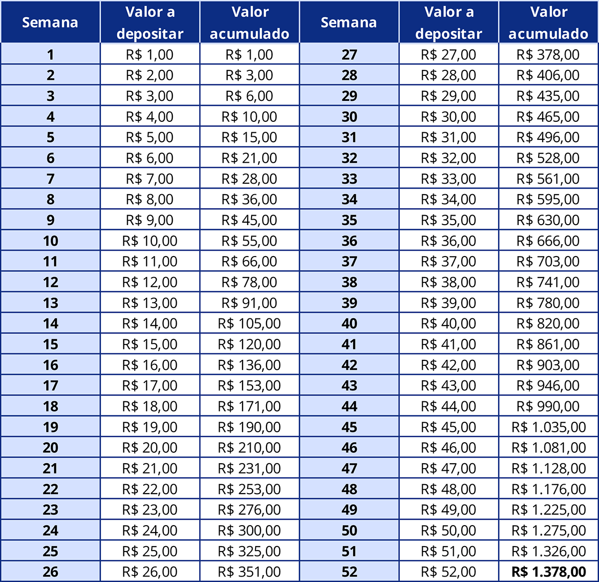 A ideia do Desafio das 52 Semanas é poupar um montante semanal e ir aumentando esse valor a cada semana. No modelo tradicional, começa-se com R$ 1,00 na primeira semana, R$ 2,00 na segunda, R$ 3,00 na terceira e assim por diante, até chegar à 52ª semana.